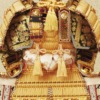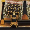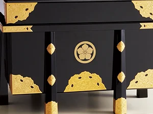 畳入りの黒塗飾台と金砂子柄の三曲屏風の構成