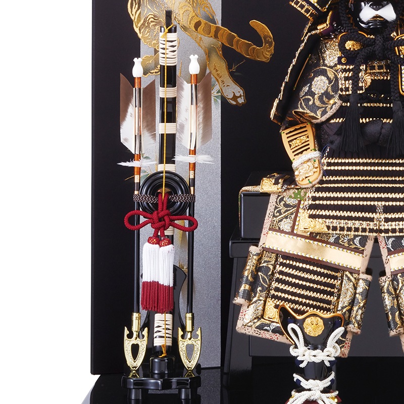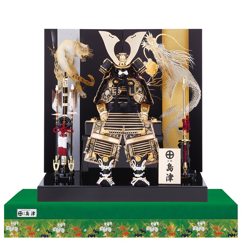 お子さまを守護する龍虎柄黒屏風と黒塗飾台の趣のある美しいお飾り
